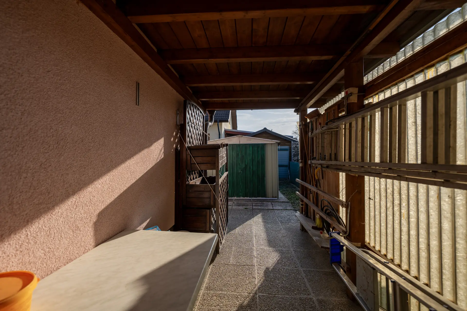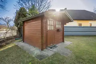Im Garten stehen eine Gartenhütte sowie eine weitere Blechhütte als praktische Stauraumlösungen zur Verfügung.