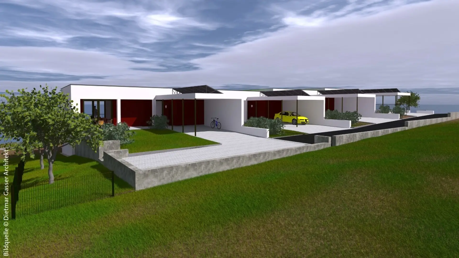 Weiters sind alle Häuser mit einem überdachten PKW-Stellplatz sowie einen PKW-Stellplatz im Freien direkt vor dem Haus ausgestattet.