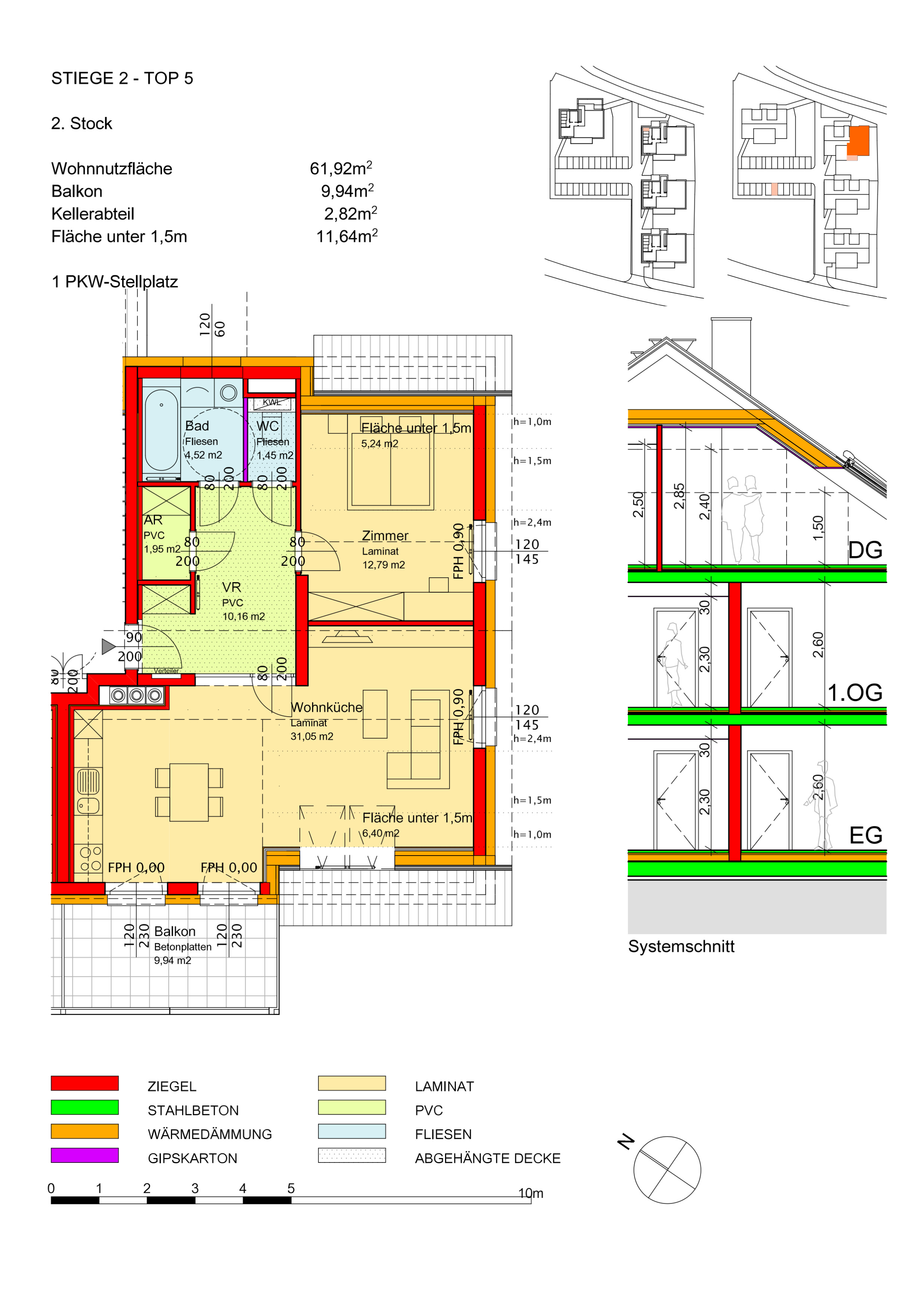 Die Stiegen 1 und 2 umfassen jeweils 5 Einheiten. Jede Wohnung verfügt über einen Balkon oder Eigengarten mit Terrasse, je einem Kellerabteil und PKW-Abstellplatz. Weiters wurden ein Kinderspielplatz, Fahrrad- und Kinderwagenraum sowie ein Müllplatz errichtet.