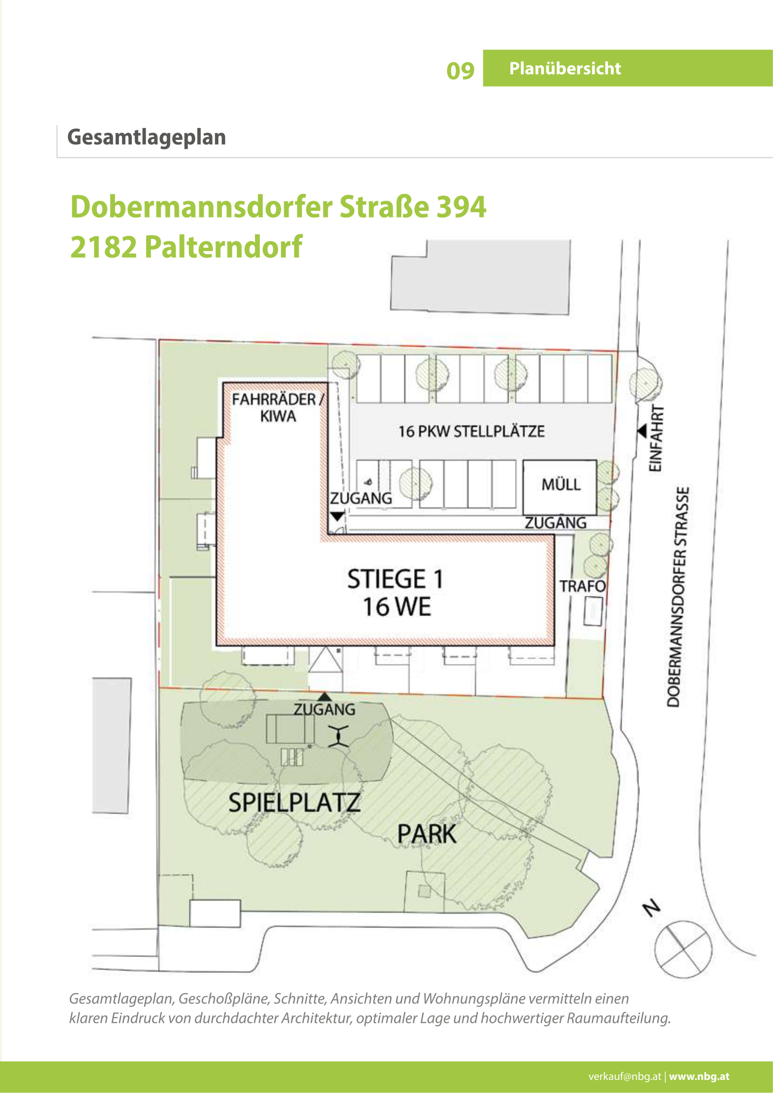Jeder Wohnung ist ein PKW-Abstellplatz im Freien zugeordnet. Zusätzlich stehen ein  Fahrradabstellraum, ein Müllraum sowie ein gemeinschaftlicher Kinderspielplatz zur  Verfügung.