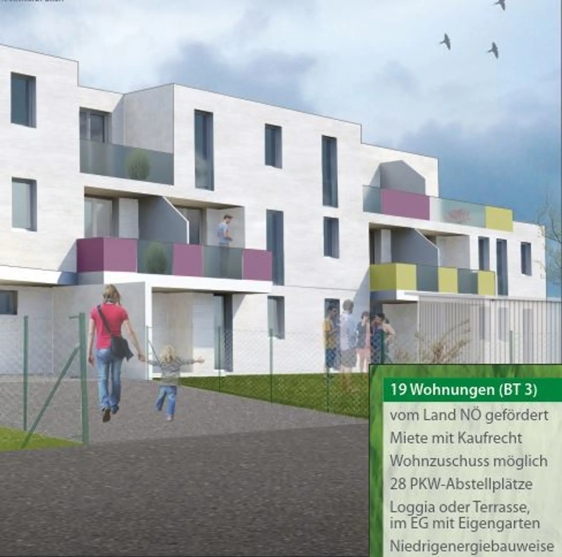 Die Wohnhausanlage wurde von Land Niederösterreich gefördert! Die Mieter müssen den Förderkriterien entsprechen und hier ihren Hauptwohnsitz begründen. Ein Wohnzuschuss seitens des Landes ist je nach Einkommen möglich.