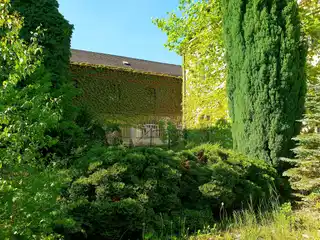 - Garten mit hohen Bäumen hinter dem Gebäude