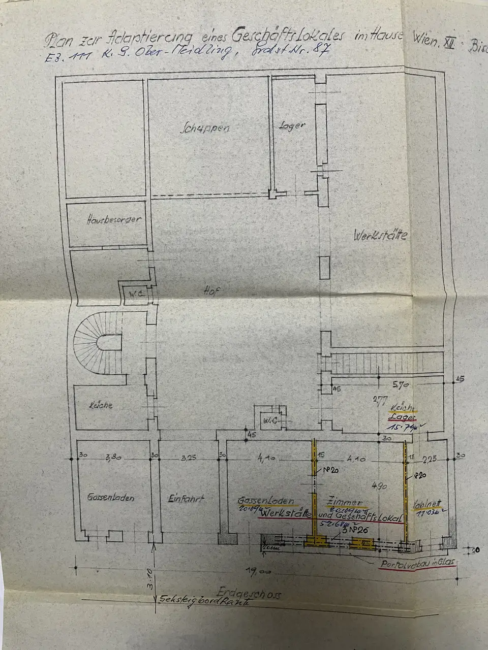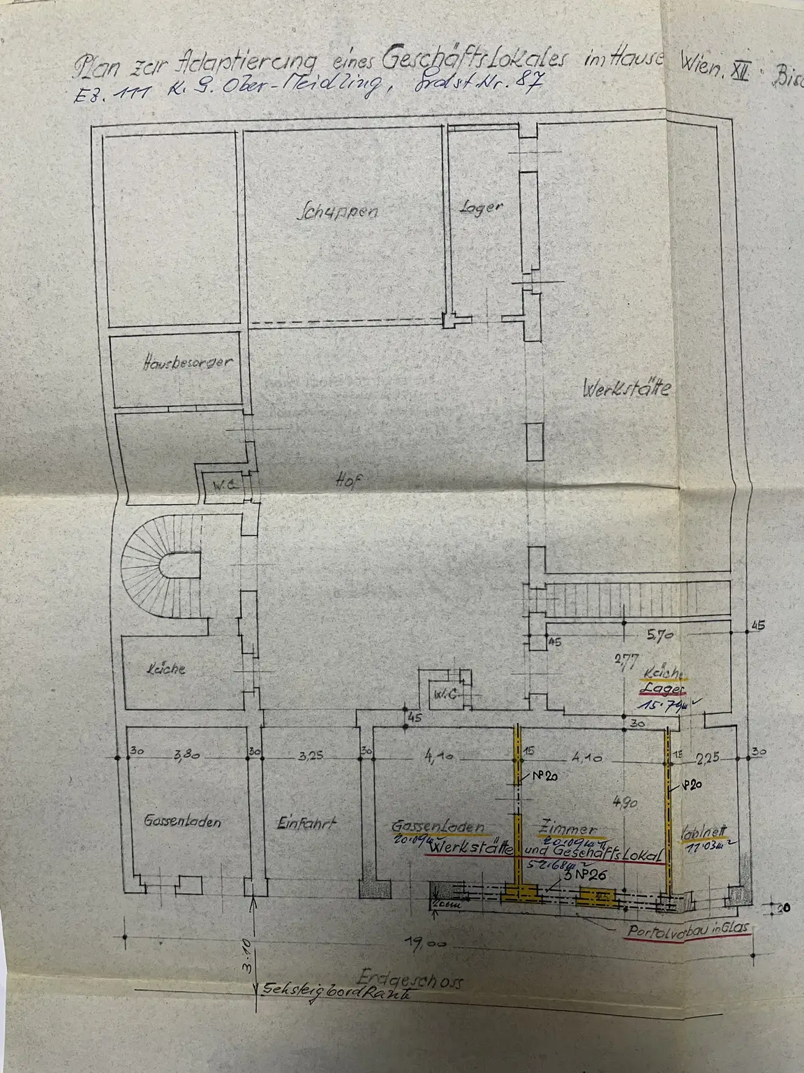 • Bestand: Erdgeschoss (Gassenladen, Einfahrt, Werkstatt, Wohnungen) + 1. Stock (Wohnungen/Zimmer) + Nebengebäude im Hof.