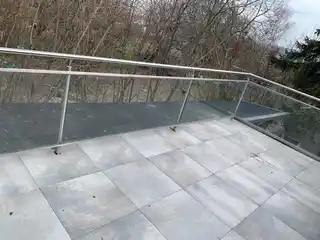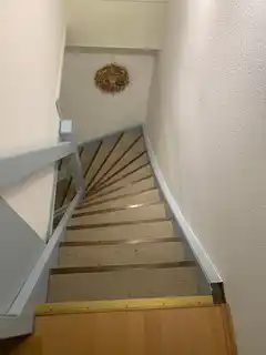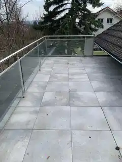 Zur ca. 25 m² großen Terrasse kommen Sie von der Außenseite. Sie befindet sich über der Garage. In der Mietwohnung befindet sich eine Klimaanlage, die Schlafzimmer und Wohnzimmer kühlen kann.