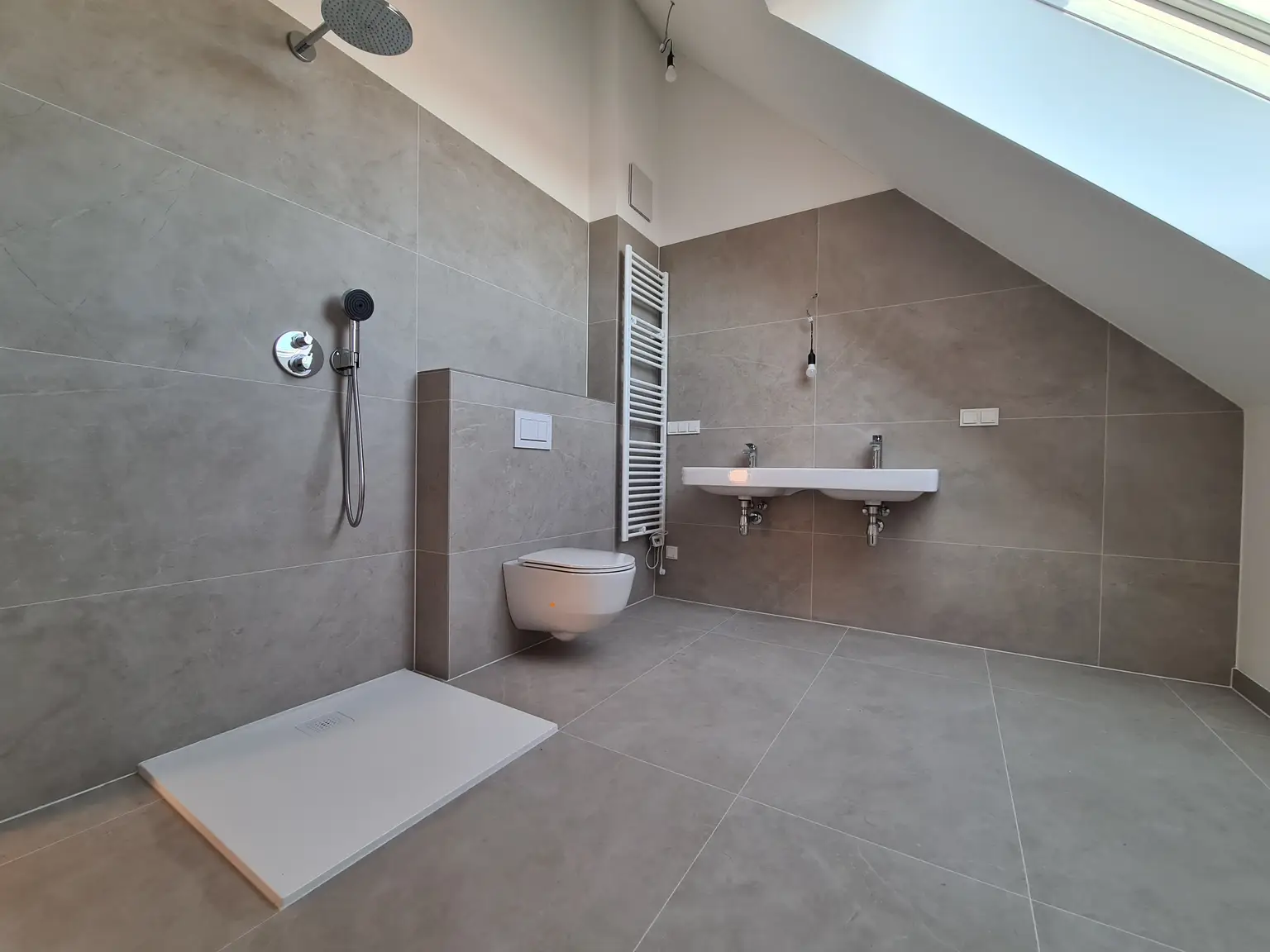 Die Badezimmer überzeugen mit Marken-Armaturen und großflächigen hellen Keramikfliesen.