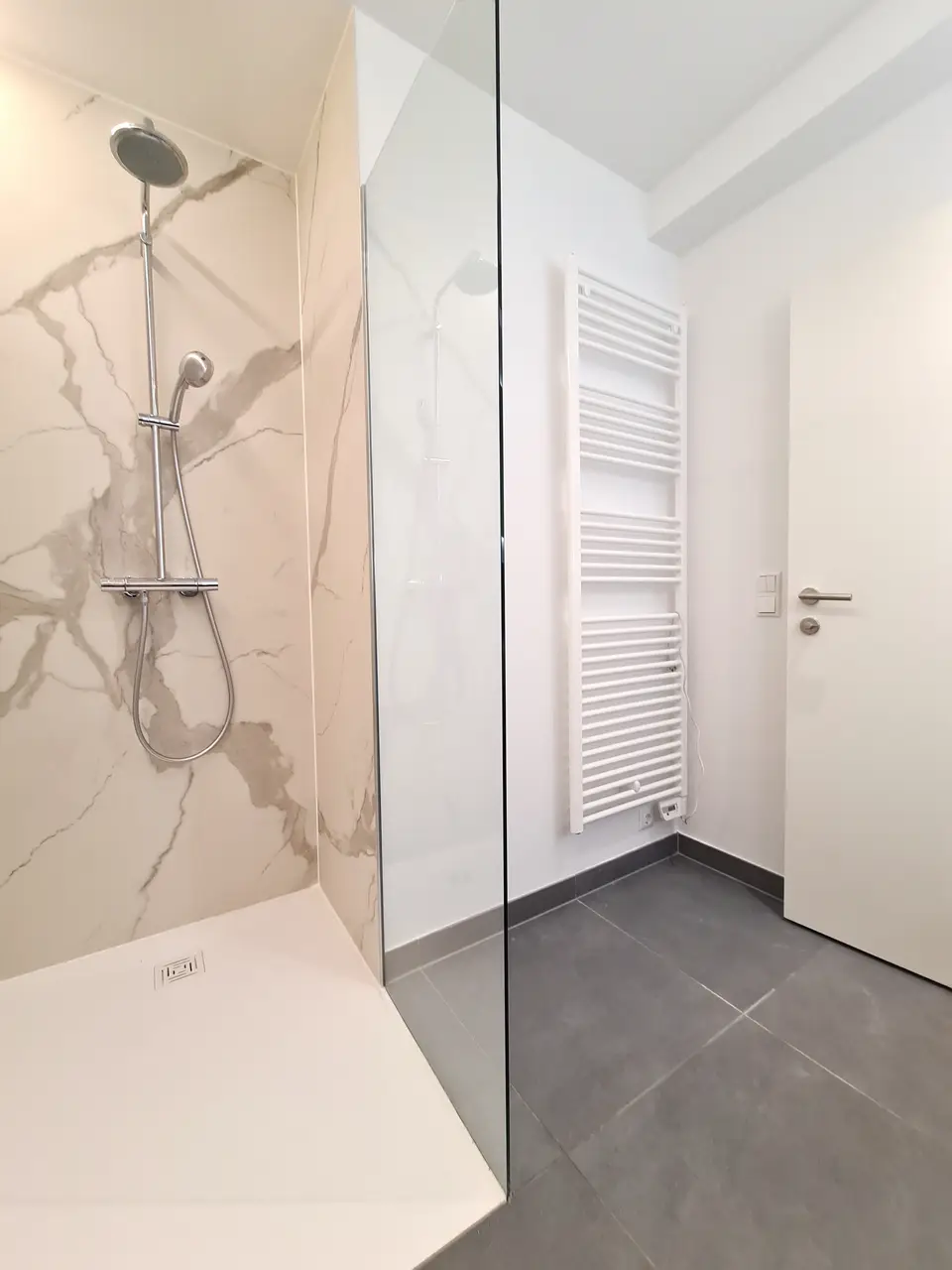 Exklusive Badezimmer großer Spiegel mit LED-Beleuchtung, rutschfeste, bodengleiche Zement Duschtasse, Designmöbel mit Aufsatzwaschbecken und elektrischer Handtuchwärmer. Die raumhohen Carrara Optik Fliesen fast fugenlos.
