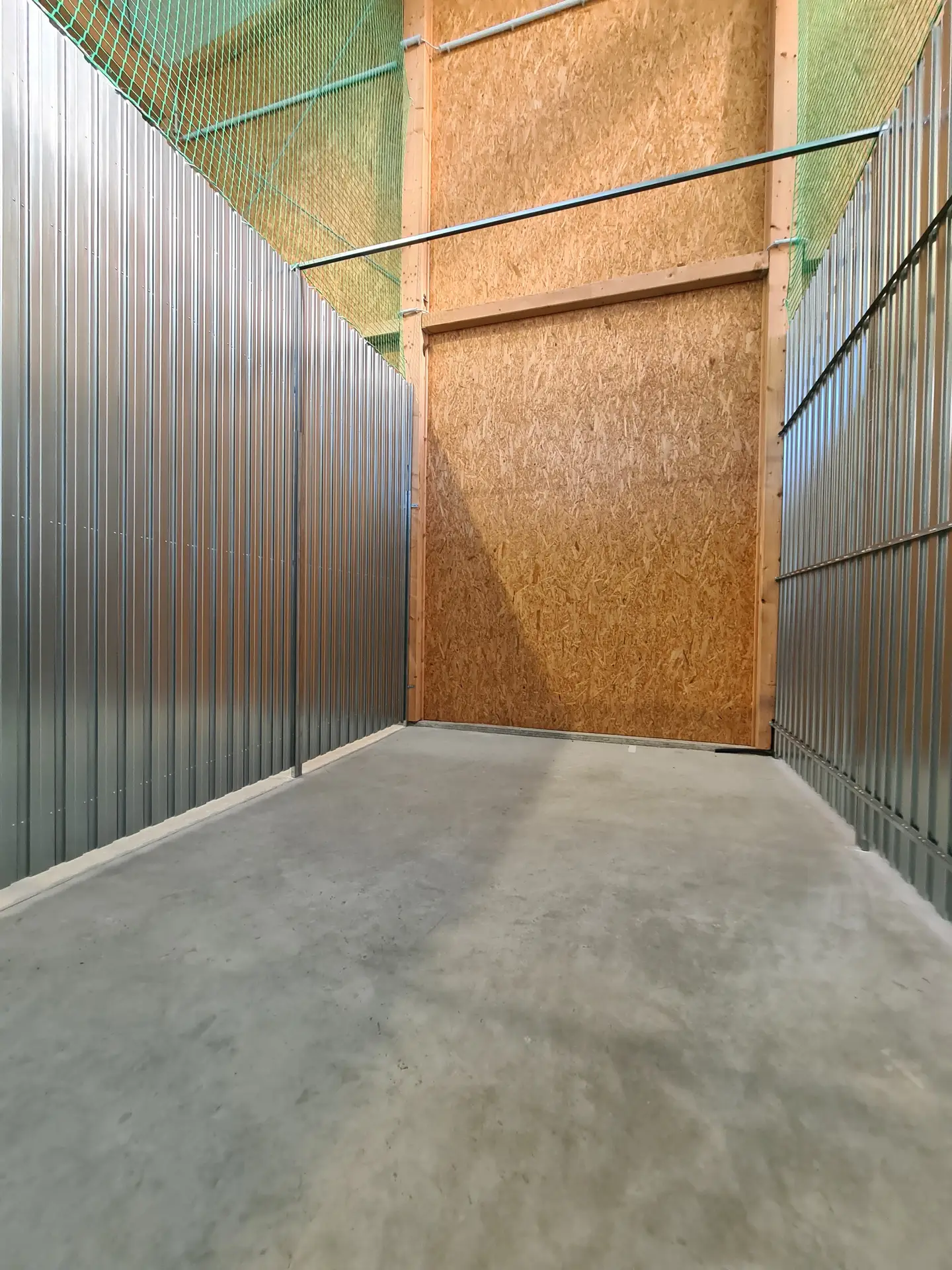 Die Trennwände sind 2,90 m hoch, es ist eine Höhe bis zu 6 Metern möglich, ideal also für Stellagen oder Regale, die Boxen werden zusätzlich oberhalb der Trennwände durch Sicherheitsnetze getrennt.