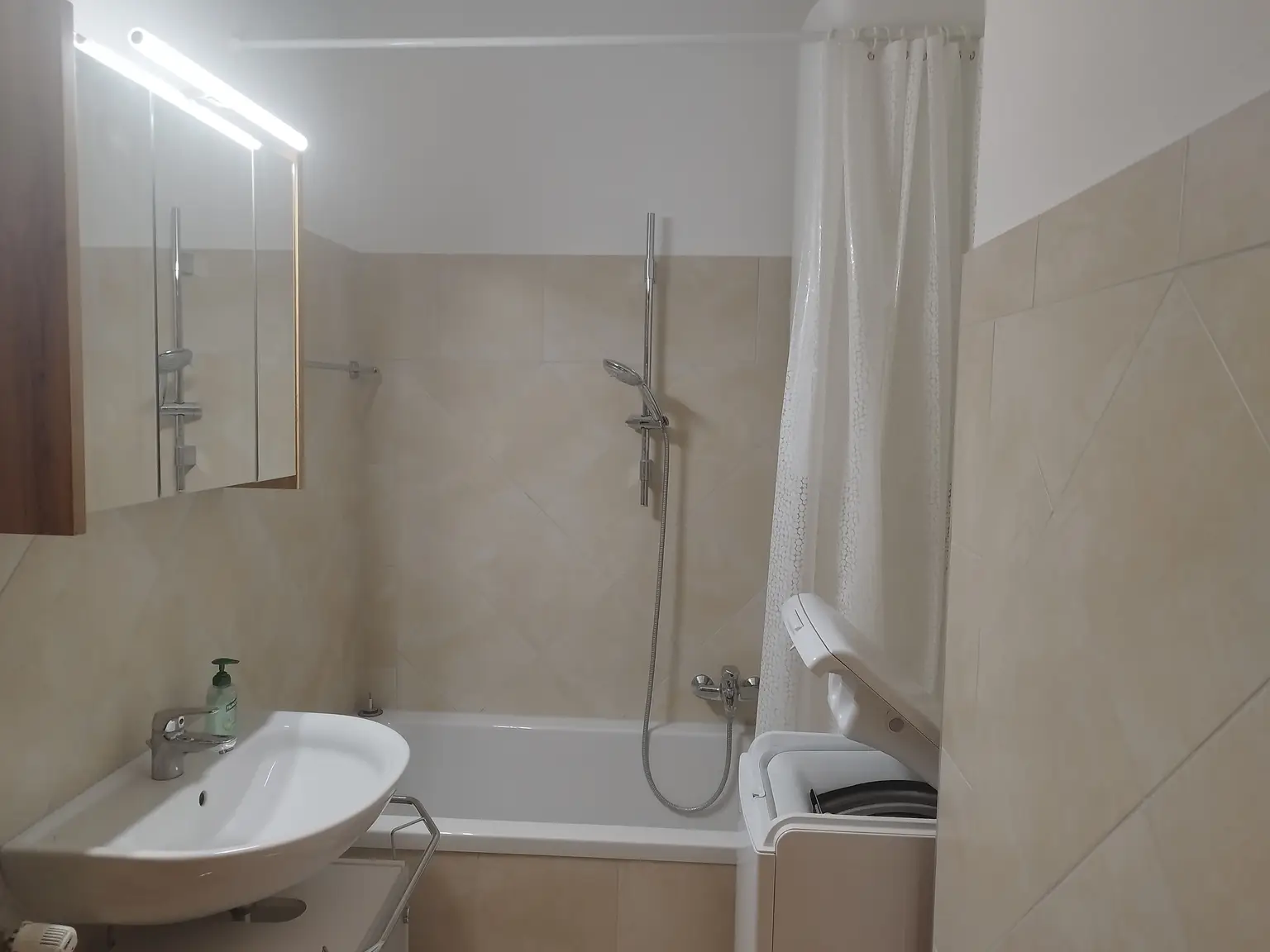 - Gepflegtes Badezimmer mit Badewanne, modernes Waschbecken, Waschmaschine (Top Loader) vorhanden