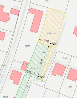 Das beigefügte Bild zeigt einen Vorschlag zur optimalen Teilung des Gesamtgrundstücks von 1821 m². Die Teilung wird durch einen Geometer vorgenommen, und die Kosten dafür trägt der Verkäufer. Bitte beachten Sie, dass die genaue Teilung noch mit der Gemeinde besprochen werden muss, um alle rechtlichen Anforderungen zu erfüllen.