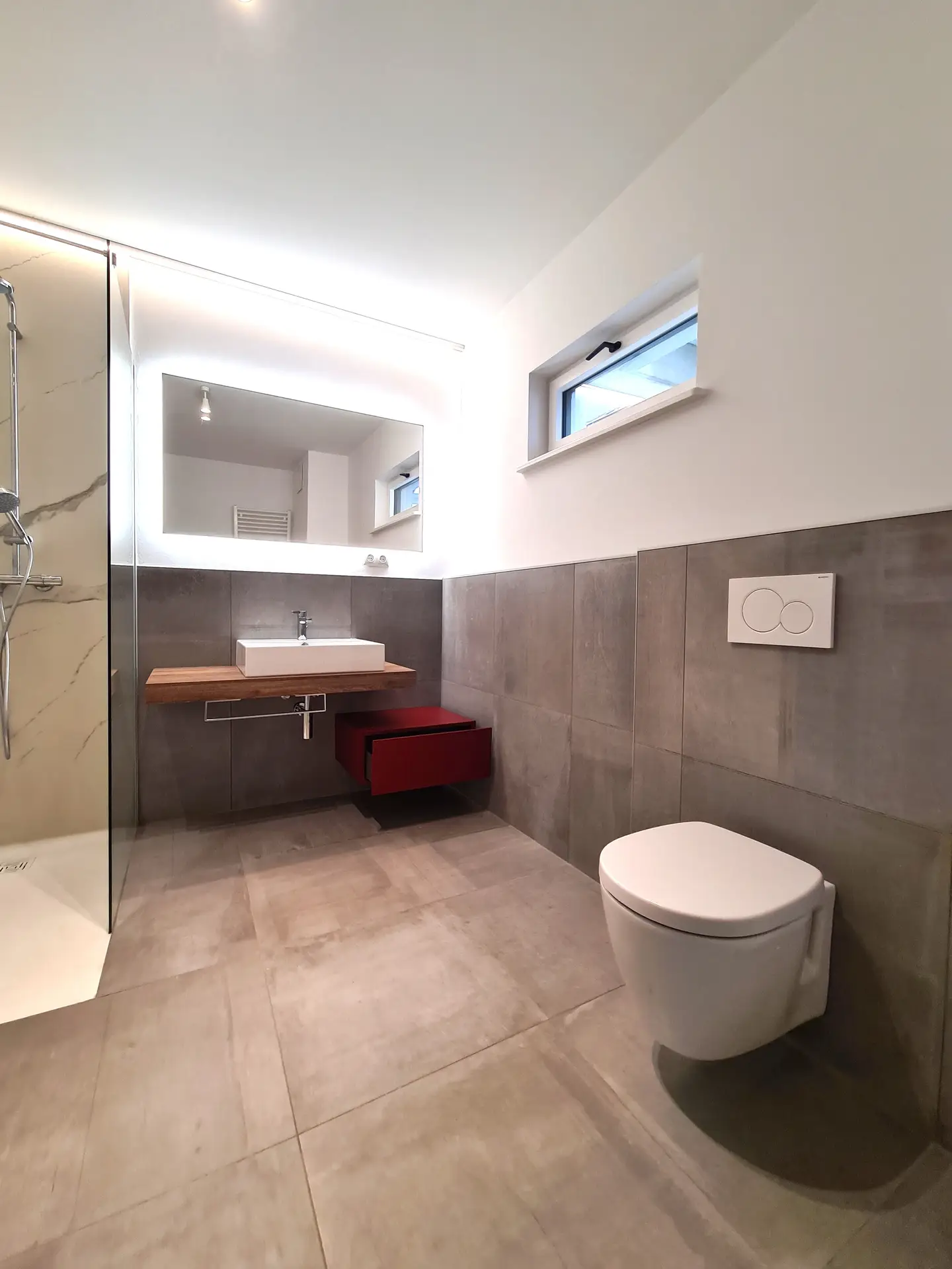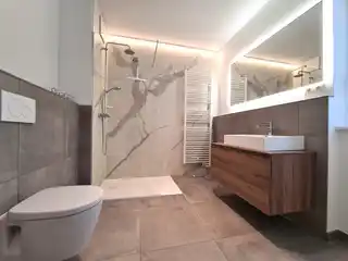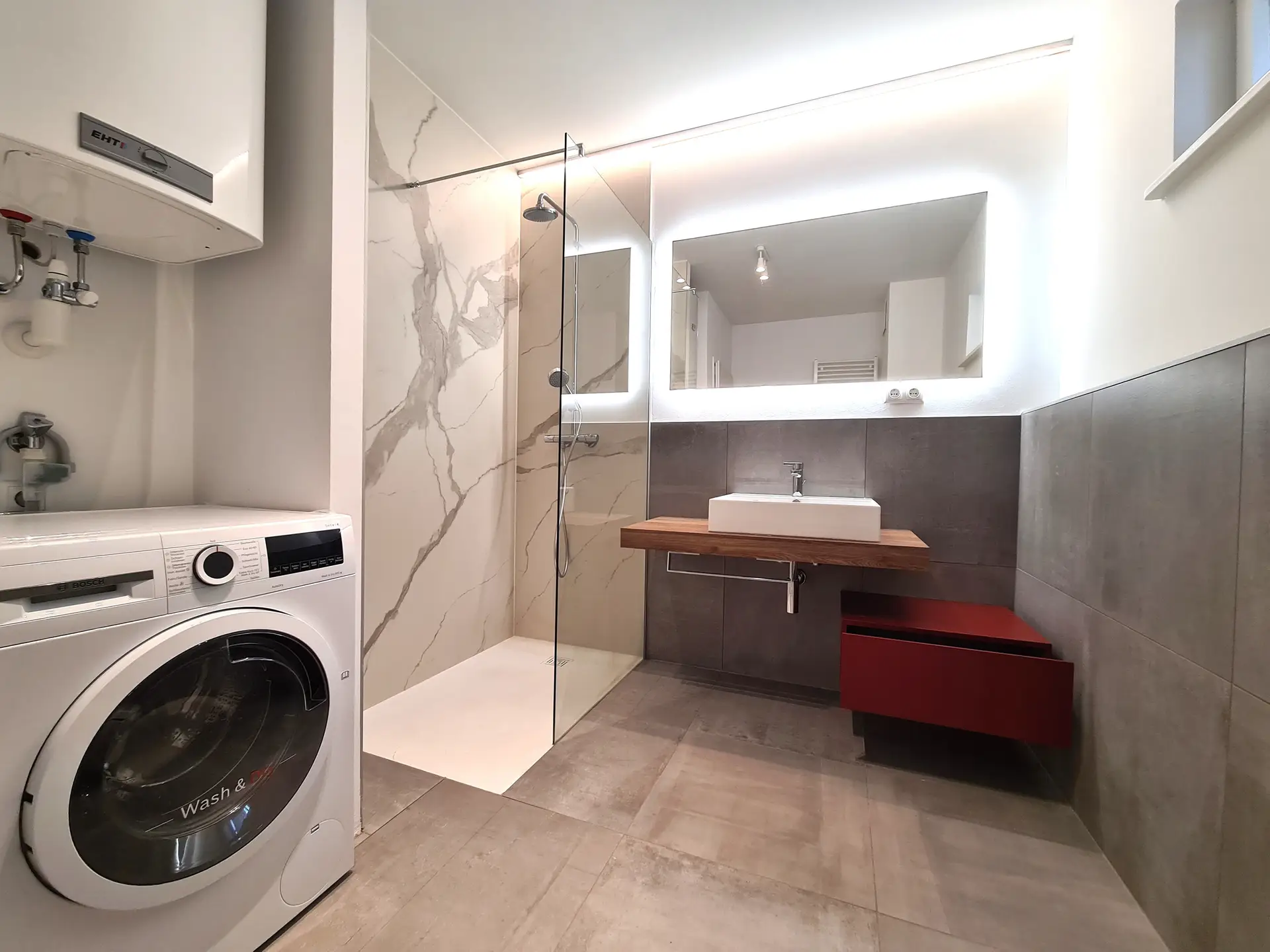 Exklusive Badezimmer großer Spiegel mit LED-Beleuchtung, rutschfeste, bodengleiche Zement Duschtasse, Designmöbel mit Aufsatzwaschbecken und elektrischer Handtuchwärmer. Die raumhohen Carrara Optik Fliesen fast fugenlos.