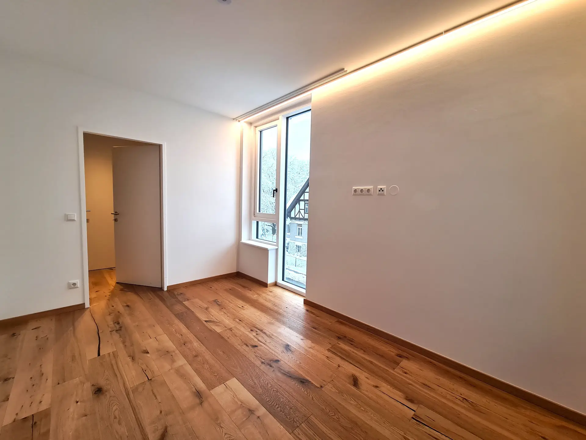 In Wohnung wurde ein hochwertiger Eichenboden verlegt und 3-fach verglaste Panoramafenster eingebaut.