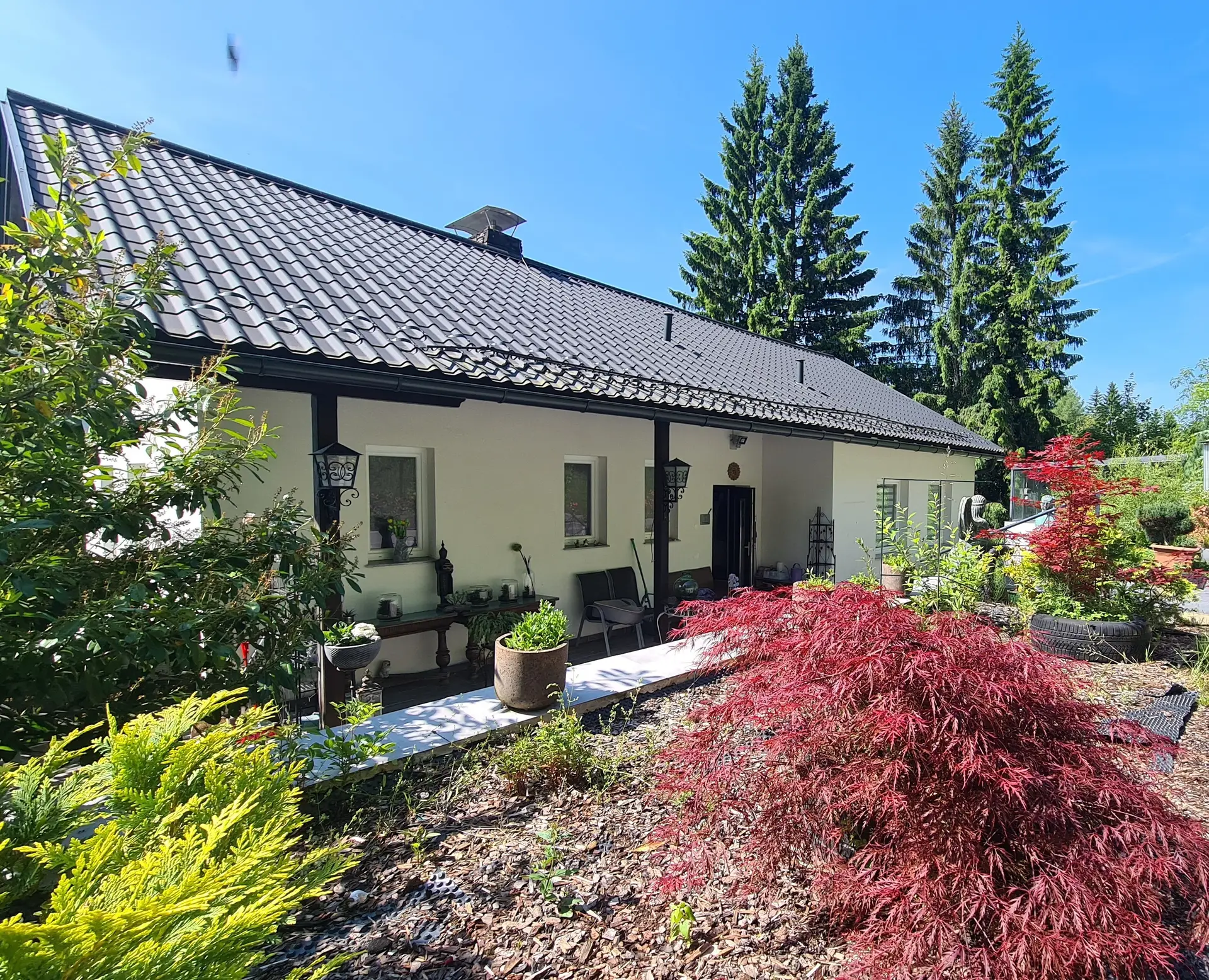 Fliesen, Laminat, Parkett, Steinboden, Solarenergie, Zentralheizung, Einbauküche, Wohnküche / offene Küche, Nordbalkon / -terrasse, Bad mit Fenster, Badewanne, Dusche, DV- / EDV-Verkabelung, Carport, Sauna, Wasch- / Trockenraum, Luftwärmepumpe, Südostbalkon / -terrasse, Bidet, Wintergarten, Abstellraum, Holz, Getrennte Toiletten, Rollladen, Gäste-WC, Satteldach, Massiv, Bergblick, Fernblick, Doppel- / Mehrfachverglasung, Kunststofffenster, Bad mit WC, Ziegel, Grünblick, E-Ladestation für KFZ